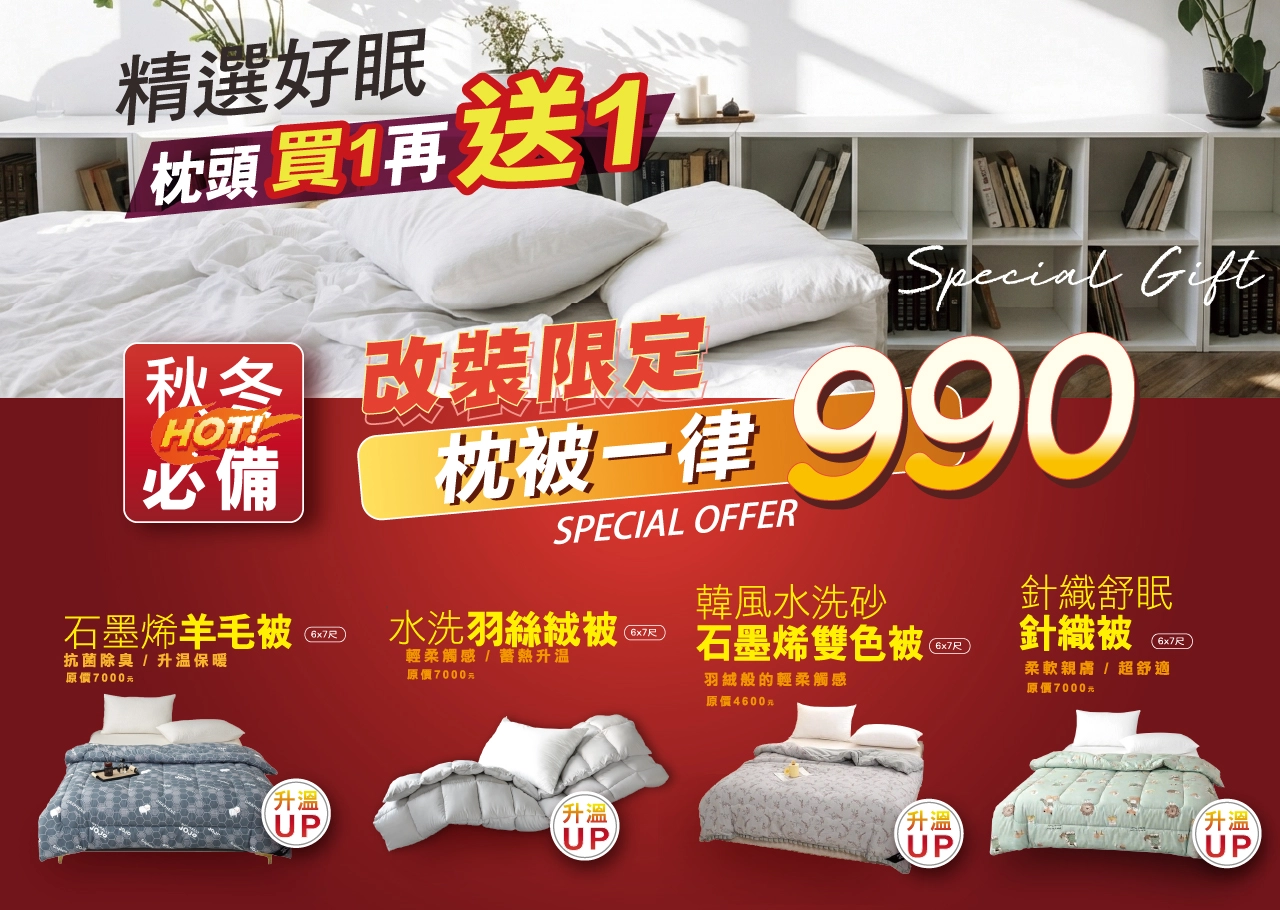 多款枕頭提供 買一送一,特價 990 元,適合全家替換使用。