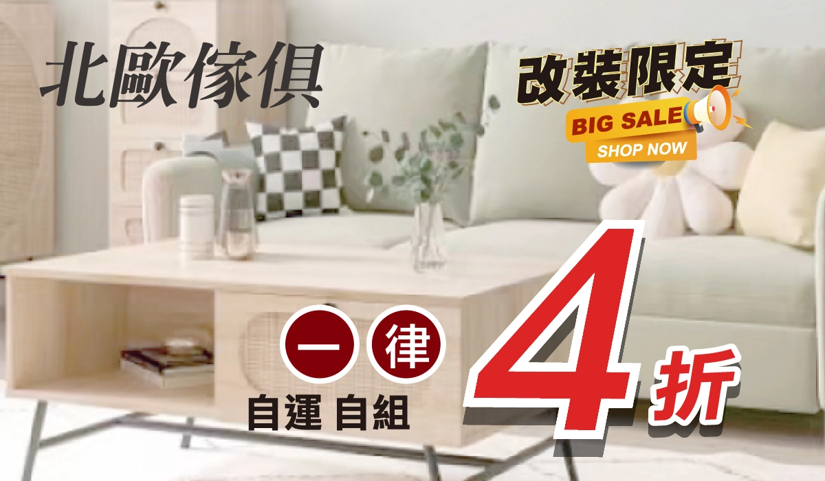 喜愛極簡風格的你絕不能錯過北歐家具專區。多款家具皆採簡潔設計並兼具實用性,本次改裝優惠吸引度十足,一律四折。需自行組裝及運送,但價格相當可觀,是打造北歐風新家的理想選擇。