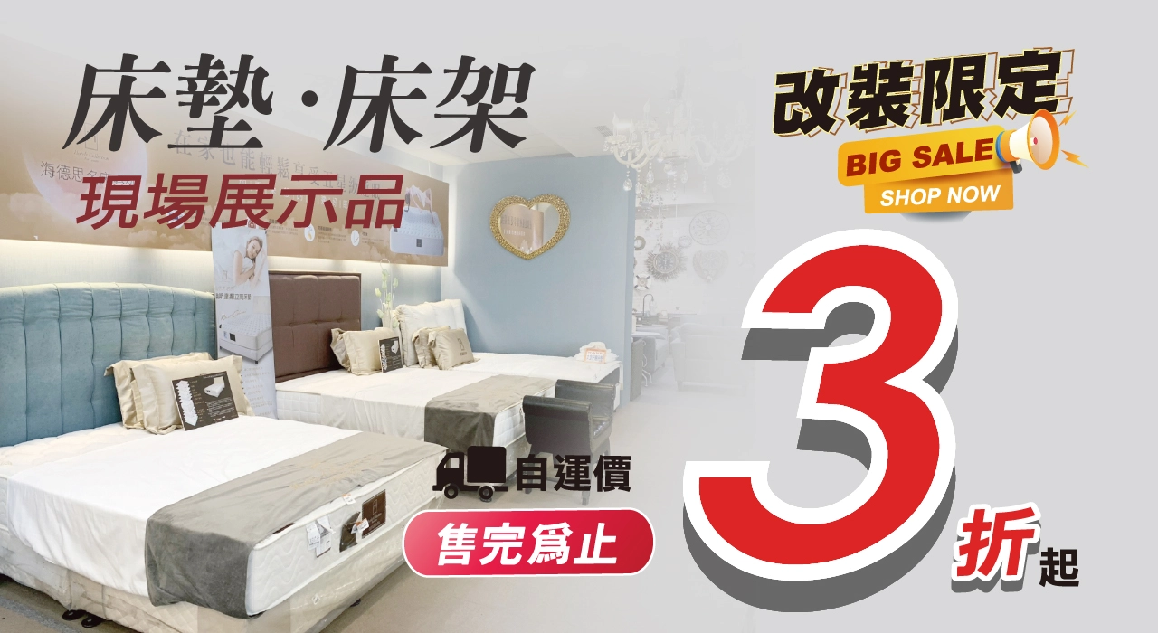 沙鹿店現場展示的床墊與床架也同步釋出優惠,自行運送即可享 三折起。若你剛好在尋找床墊或床架,不妨到現場親自感受彈性、支撐度與材質的差異,把握機會入手理想床具。